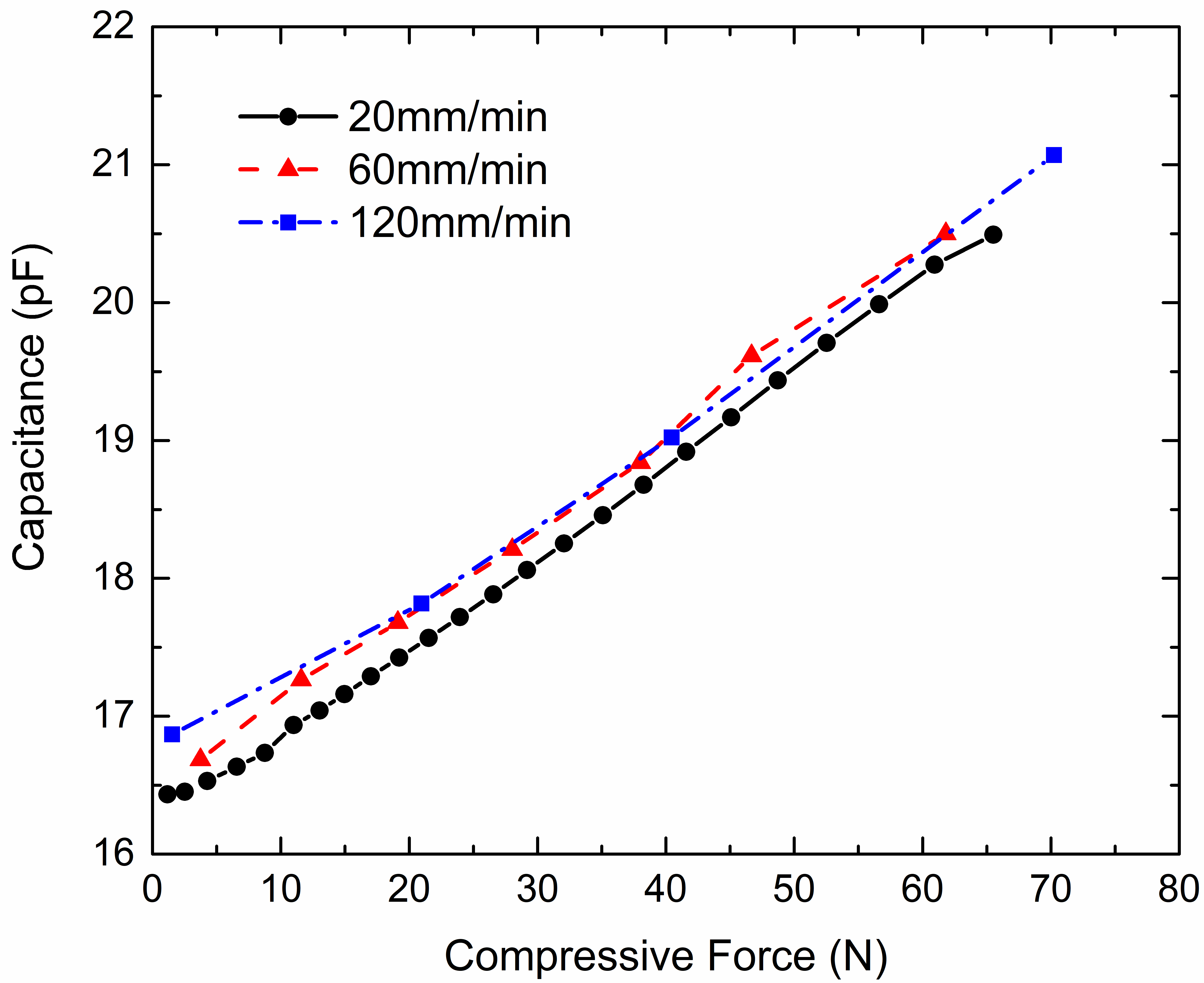 为了标定载荷与测量电压的变化关系,研究人员首先通过对传感器进行不同速度的均匀加载实验测量电容在变形过程中的变化。为了验证传感器结构的可行性,先使用了阻抗分析仪作为测量系统,记录传感器在加载过程中的电容变化,分别在20、60、120 mm/min的位移加载速度下进行了均匀压缩测试,根据人体平均的咬合幅度,将最大压缩位移均设置为3 cm。如上图所示,测试所得电容与压缩力的关系均呈线性关系,并且不同速度下的测试结果基本一致,证明了传感器性能的速率无关性。