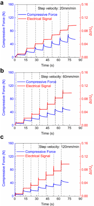 在对传感器进行准静态测试标定验证之后,研究人员进一步对其进行阶跃加载的测试,以表征传感器在瞬态载荷下的响应性能。如下图所示,测试设置了三个不同的位移阶跃速度,a、b、c图分别对应20、60、120 mm/min,每个速度下分为7次阶跃加载,每次阶跃的位移为0.5 cm,总位移为3.5 cm,位移阶跃之间有10秒的位移维持阶段。从图中可以看出电压的相对变化与加载的过程基本同步,并且在位移维持阶段电压仍旧保持稳定。