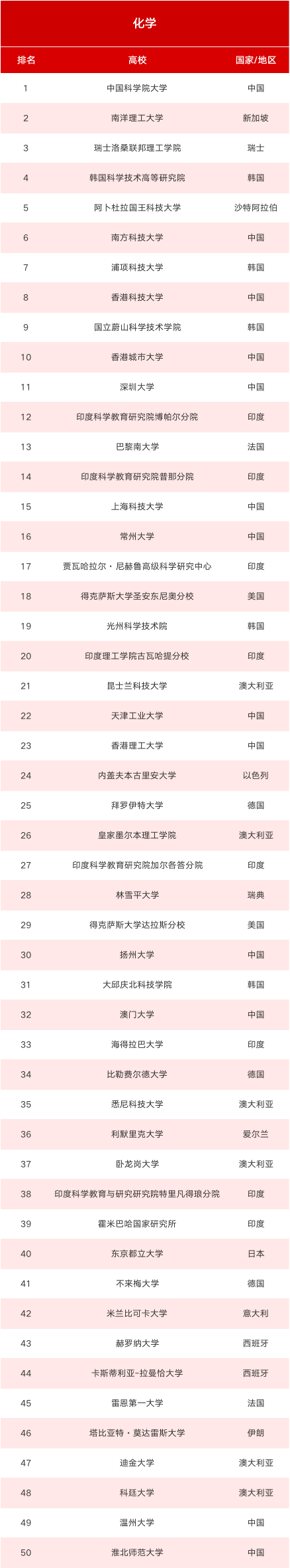 在50强榜单中,中国9所上榜高校分别是中国科学院大学(第1)、香港科技大学(第5)、南方科技大学(第7)、香港城市大学(第12)、深圳大学(第13)、上海科技大学(第22)、香港理工大学(第24)、常州大学(第39)和扬州大学(第47)。