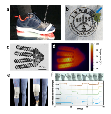 导电蚕丝纱线具有(a)疏水性。(b)耐溶剂(丙酮、乙醇、甲苯、甲酸、六氟异丙醇)腐蚀性,箭头所指处展示绣花基底无纺布已被腐蚀镂空。(c,d)吸热保温性,图为绣花机加工图案红外灯照射后的热像仪图像。(e,f)应力响应性,可用来监测行走或进行手势翻译。