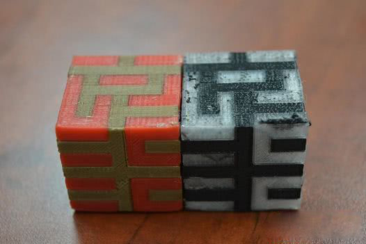 这样一来,就可以通过控制材料的精确切换,来打印两种材料,实现下图这样的效果。