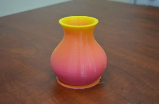 如果想使用一个喷头来打印多种材料,则会变得非常困难,尤其很难实现在精确的位置更换材料,主要是因为在不同材料之间的切换速度太慢了。因此,只能做成混色的效果,就像下图这样。