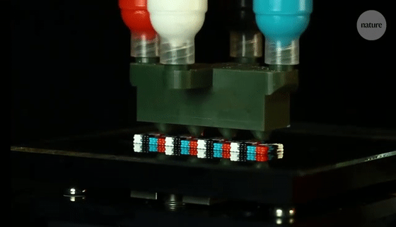 文章报道了一种多材料3D打印技术(MM3D),其通过在单个喷嘴喷出材料时的快速切换,实现了体素级的多材料功能结构的快速打印,极大的拓展了3D打印在复杂功能结构的制造能力。也就是说,用一个喷头,快速切换打印材料,来实现多材料的精准打印,就像下面这样。