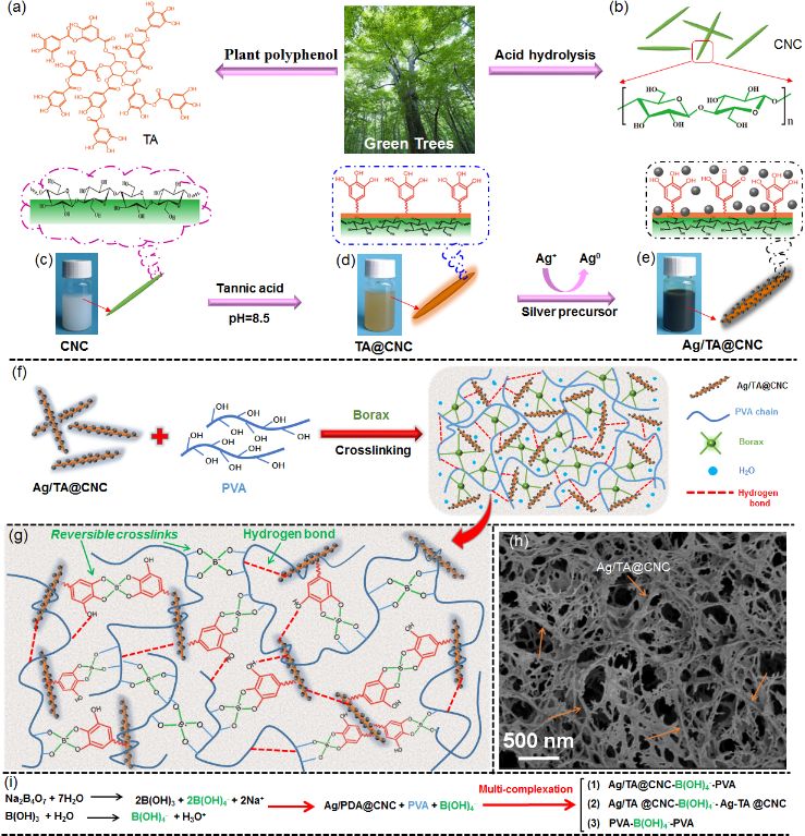 图1.(a,b)TA和CNC的化学结构,(c-e)功能性纳米纤维素(Ag/TA@CNC)合成示意图。(f)PB-Ag/TA@CNC纳米复合水凝胶的构建示意图。(g)PB-Ag/TA@CNC水凝胶中动态硼酸酯键和氢键结合示意图。(h)PB-Ag/TA@CNC水凝胶的微观结构(Ag/TA@CNC=4.0 wt%)。(i)Ag/TA@CNC、PVA和硼砂之间的多种结合方式。