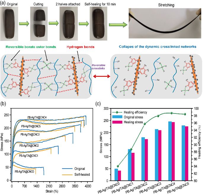 图2.(a)PB-Ag/TA@CNC自愈合过程演示及其自愈合机理。(b)不同Ag/TA@CNC含量的PB-Ag/TA@CNC水凝胶的应力-应变曲线及其在愈合10 min后的应力-应变曲线。(c)PB-Ag/TA@CNC水凝胶的初始应力,自愈应力以及自愈合效率