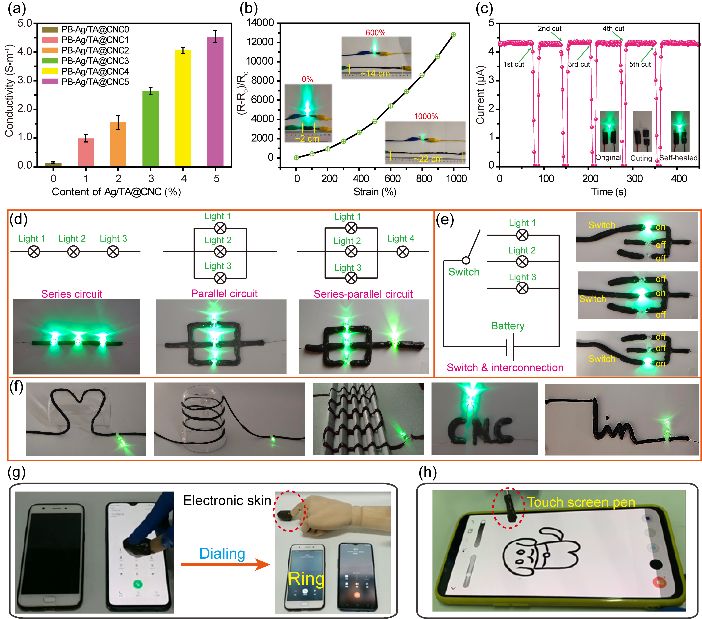 图3.(a)PB-Ag/TA@CNC水凝胶的导电性。(b)PB-Ag/TA@CNC水凝胶电阻随应变的变化情况。(c)PB-Ag/TA@CNC水凝胶多次切断-自愈合过程电流随时间的变化情况。(d)PB-Ag/TA@CNC水凝胶用于串联电路,并联电路和串联-并联电路的设计。(e)PB-Ag/TA@CNC水凝胶用于单刀三掷开关电路设计。(f)PB-Ag/TA@CNC水凝胶用于多种预定图案的电路设计。(g)基于PB-Ag/TA@CNC水凝胶的电子皮肤用于拨打智能手机号码。(h)PB-Ag/TA@CNC水凝胶触控笔用于电子屏幕的绘画。