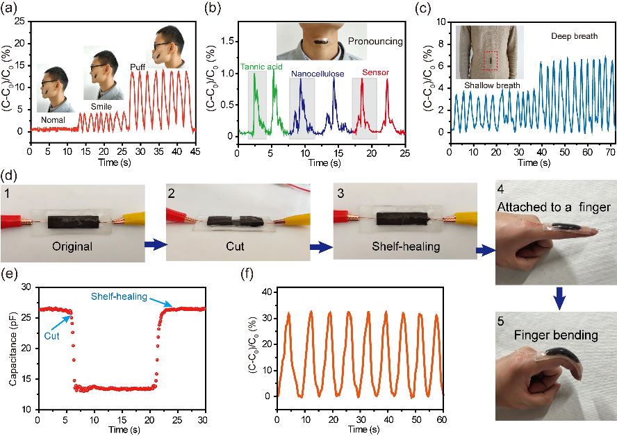 图5. PB-Ag/TA@CNC水凝胶电容传感器在人体微小运动检测的运用及其自愈性能分析。(a)面部表情变化过程产生的电容信号;(b)发音过程产生的电容信号;(c)不同呼吸频率产生的电容信号。(d)基于PB-Ag/TA@CNC水凝胶自愈合电容传感器的自修复过程演示。(e)在切段与自愈合过程中水凝胶电容传感器的电容变化情况。(f)自修复后的电容传感器用于手指周期性弯曲监测。