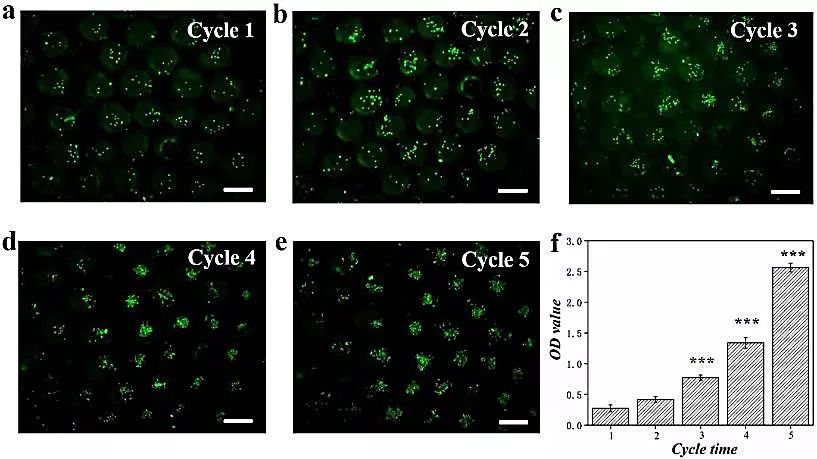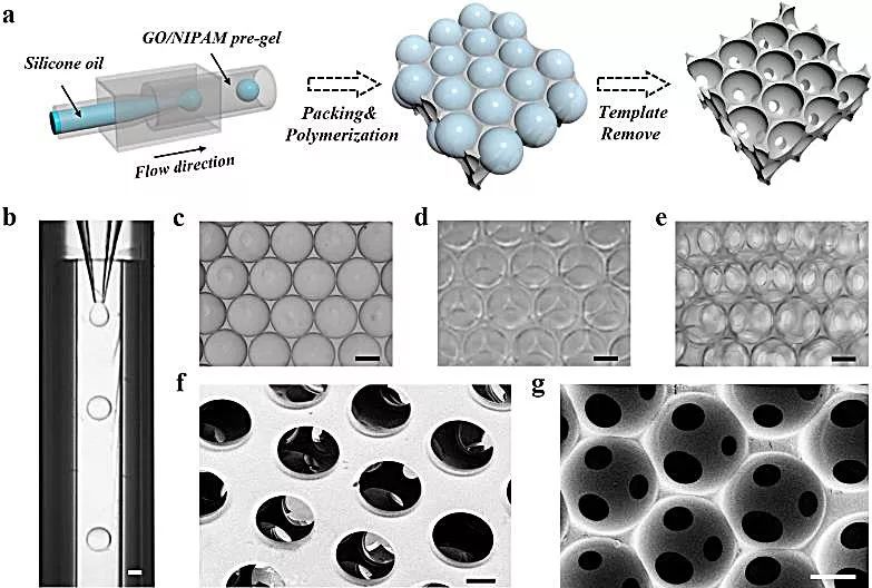 在本研究中,研究人员以GO和温敏性水凝胶N-异丙基丙烯酰胺(NIPAM)为骨架材料,制备了反蛋白石GO水凝胶支架。实验证明,所得的支架具有尺寸均匀且相互连通的孔洞结构,为细胞的迁移和营养物质的运输提供了便捷通道,同时可以有效地预防内部细胞的坏死。此外,由于GO的光热转换和NIPAM水凝胶的热响应形变能力,通过控制近红外光源的开合,可以实现支架材料的动态收缩,从而完成对悬浮细胞的快速富集。