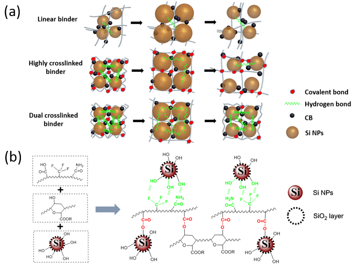 图1.(a)线性粘结剂、高度交联粘结剂和双网络粘结剂作用下硅基电池中硅颗粒脱嵌锂体积变化示意图,(b)氟聚合物粘结剂、海藻酸钠和硅基表面之间共价键和氢键键连结构示意图