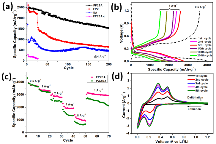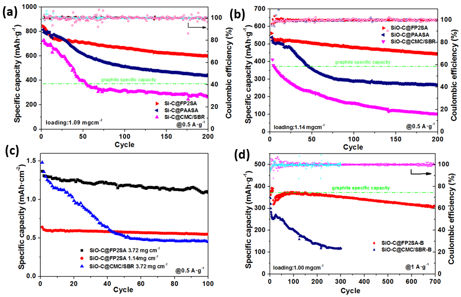图3.电化学性能图:(a)Si-C@FP2SA,Si-C@PAASA,Si-C@CMC/SBR电极;(b)SiO-C@FP2SA,SiO-C@PAASA,SiOC@CMC/SBR电极;(c)SiO-C@CMC/SBR电极和不同负载量的SiO-C@FP2SA电极;(d)SiO-C@FP2SA-B和Si-C@CMC/SBR电极。
