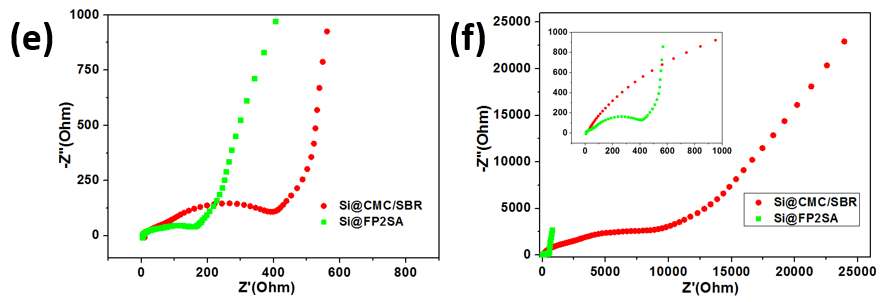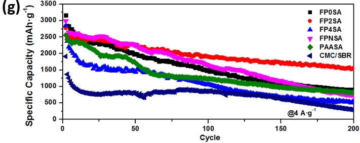 图2.(a)Si@FP2SA, Si@FP, Si@SA, and Si@FP2SA-L电极循环性能;(b)Si@FP2SA在不同循环次数下的循环曲线;(c)Si@FP2SA和Si@PAASA电极的倍率性能;(d)Si@FP2SA电极的CV曲线;(e)(f)使用FP2SA和CMC/SBR粘结剂下硅基电极阻抗图;(g)FP0SA, Si@FP2SA, Si@FP4SA, Si@FPNSA, Si@PAASA, and Si@CMC/SBR电极循环性能。