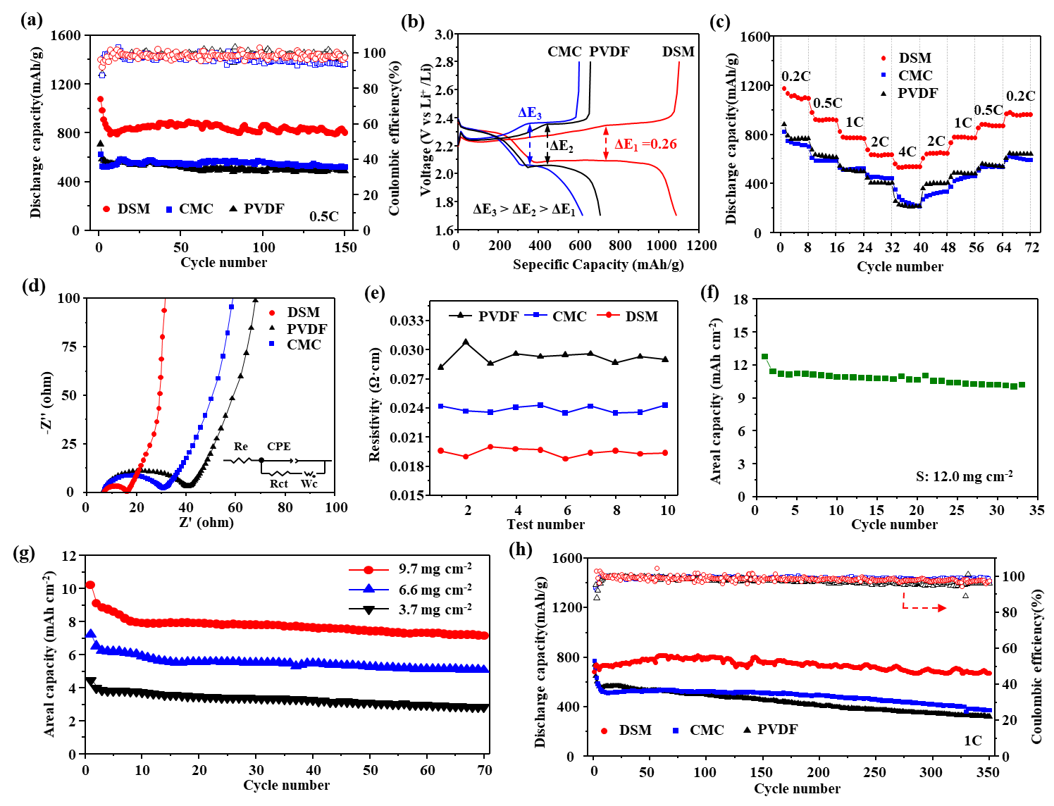 图4. S/DSM,S/CMC和S/PVDF在0.5C(a)和1C(h)下的电化学性能;S/DSM,S/CMC和S/PVDF电池(b)首次充放电压、(c)倍率性能、(d)阻抗性能和(e)电阻率;(f)(g)不同硫负载下S/DSM电池的电化学性能