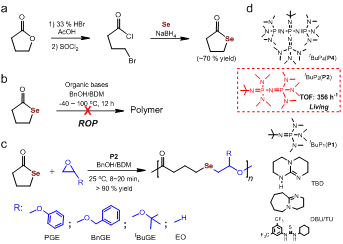 最近,浙江大学张兴宏教授课题组通过环氧单体与γ-硒代丁内酯的交替共聚,首次实现了主链含硒聚酯的合成(图1)。作者以生物质的γ-丁内酯作为原料,参照文献方法由两步反应,得到了γ-硒代丁内酯。然而与γ-丁内酯不同,实验证实γ-硒代丁内酯的开环聚合非常困难(?40 ~100 °C,有机碱),原因主要在于γ-硒代丁内酯具有更低的环张力。他们采用环张力大的环氧单体与γ-硒代丁内酯进行共聚反应,以有机碱为催化剂,实现了室温下γ-硒代丁内酯的开环聚合。共聚反应具有近乎完美的交替共聚和区域选择性反应特征:所得含硒聚酯的交替度> 99%,头尾结构含量> 99%,且可以由控制单体的量实现“开-关”共聚。所得的含硒聚酯每个链节均含有常见的酯键和Se醚键,且末端基可控,可得到两端羟基的含硒聚酯,也可得到含Se-Se键的含硒高分子。所得含硒聚酯具有好的热学性能,其初始热分解温度高达275°C,玻璃化转变温度低至-59°C,溶解于常见有机溶剂中;含硒聚酯具有高的折光指数(1.61?1.62)和良好的离子电导率(掺杂锂盐,1.09 ×10?6S/cm,30 °C;1.73 × 10?4S/cm,100 °C),表明这些材料具有潜在的广阔应用前景。