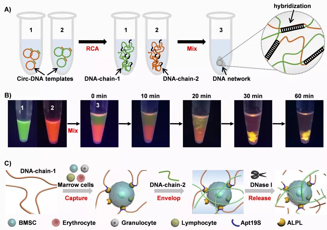 这种细胞捕获策略是通过两种超长DNA链协同作用实现:DNA链-1包含能高效靶向干细胞的适配体序列,特异性锚定干细胞;DNA链-2包含与DNA链-1部分互补的序列,通过与DNA链-1杂交形成三维网络,实现干细胞的三维包封;在核酸酶作用下,DNA网络被降解,干细胞可控释放。这种物理交联的DNA水凝胶网络不仅为细胞培养提供了弹性、半湿润和三维的类细胞外基质环境,而且其适当的孔径有利于营养物质的运输以及细胞代谢废物的排出,可以确保被包封的细胞保持良好的活性。在该研究基础上,利用DNA分子的可编程性和分子识别能力,可以设计具有不同结构和功能的DNA网络,为捕获和培养其他类型的细胞提供了一种通用策略。
