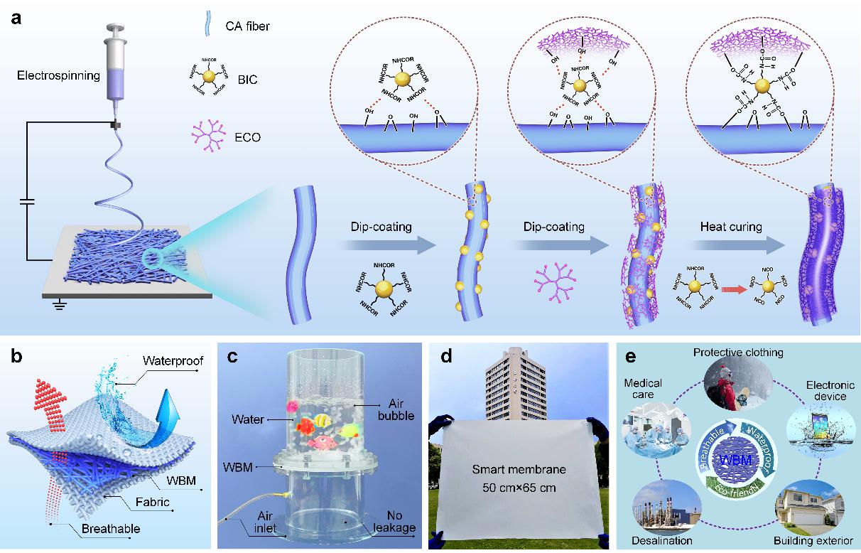 图1.(a)利用无氟水性交联剂与无氟水性疏水剂对静电纺醋酸纤维素纤维膜进行逐步涂层制备环境友好型无氟防水透湿膜的流程示意图;(b)防水透湿示意图;(c)防水透湿实物图;(d)所制备纤维膜的实物图;(e)无氟防水透湿膜的多个潜在应用领域。