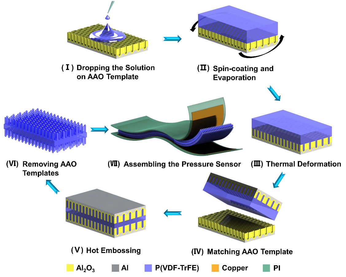 近日,济南大学信息科学与工程学院李阳副教授团队巧妙地以Anodized Aluminum Oxide(AAO)为模板在poly(vinylidenefluoride-co-trifluoroethylene) [P(VDF-TrFE)]的上下表面实现 “纳米压印”过程,简便且经济地引入双面有序排列的微结构,大大地提升了器件性能。该研究成果以“Anodized Aluminum Oxide-Assisted Low-Cost Flexible Capacitive Pressure Sensors Based on Double-Sided Nanopillars by a Facile Fabrication Method”为题发表在期刊《ACS Applied Materials & Interfaces》上。文章第一作者为2018级研究生郭云建,通讯作者为李阳副教授,济南大学为第一作者单位。