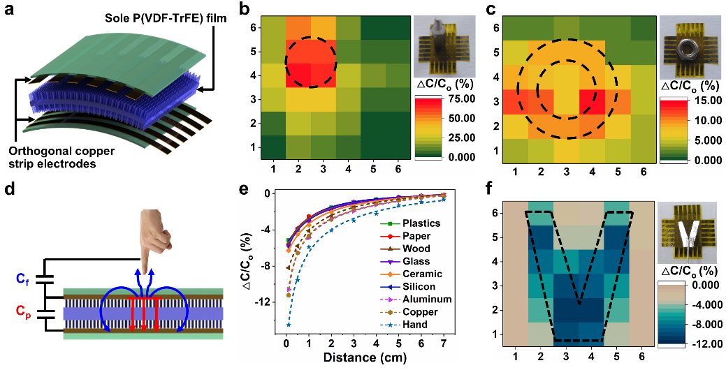 该研究团队提出了利用AAO为模板这种简便而有效的方法,来实现基于P(VDF-TrFE)介电层的柔性电容式压力传感器,使器件在响应/恢复时间、灵敏度、稳定性、非接触检测方面均展现出了优异的性能,使该器件除了能够对人体姿态与生理信号检测以外,还进一步拓宽了柔性传感器件在人体轻量化装备、医疗保健监控、智能机器人皮肤和人机界面等方面的应用。