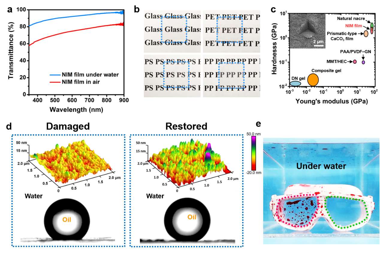传统的水下超疏油材料由于表面存在大量微纳结构而透明度较差,NIM膜则显示出了高光学透明性,在空气中可见光透过率约75%,而在水中可达到92%(图2a)。该矿化膜可以涂覆在玻璃片、PS、PET和PP等多种透明基材上,同时保持其高度透明性(图2b)。与已经报道水下超疏油材料相比,包括双网络水凝胶和有机无机复合材料,NIM膜具有最高的硬度和杨氏模量(图2c)。在严酷的外力冲击,如砂纸打磨等,遭到破坏的结构以及超疏油性能通过简单的再次生物矿化即可恢复(图2d)。将游泳镜浸入被油污染的水箱中,实验结果显示涂有NIM膜的部分是透明干净的,而无涂层的部分则被染色(图2e)。
