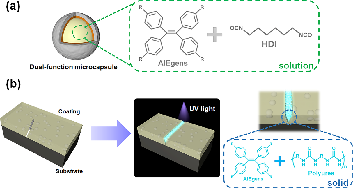 近期,香港科技大学杨晶磊教授联合唐本忠院士共同报道了一种简便的策略来巧妙构建具有自修复和自预警双功能的防锈涂层。如图1所示,研究人员通过微胶囊技术包覆了含有聚集诱导发光分子(AIEgen)的六亚甲基二异氰酸酯(HDI)溶液,再将这种单一微胶囊填充到聚合物防锈涂层中,即可赋予聚合物涂层自修复和自预警双功能。当聚合物涂层发生损伤时,产生的裂缝会破坏并穿过微胶囊,使其液体芯材流入裂缝位置。由于HDI能够自发地与水或水汽反应生成聚脲(PU),新生成的PU聚合物会填充并修复裂缝,阻隔水对金属基材的腐蚀,故该涂层具有自修复功能,能够延长其防锈使用寿命。由于AIEgen在溶液状态下不发荧光或者发微弱荧光,而在固体聚集态下其荧光显著增强,所以能够使修复后(聚合后)的位置发强荧光,起到指示作用。该策略巧妙地结合了HDI和AIEgen各自的特殊性质,成功在单组分的微胶囊中实现双重功能。其中,HDI既起到修复剂的作用,又能充当AIEgen的溶剂,因此无需添加任何有机溶剂,大大简化了材料组成和制备工艺。