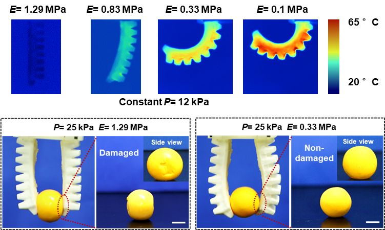 如同人坐在沙发上比坐在板凳上更为舒适,两个接触物体间的相近的刚度匹配能够将对物体的损伤降到最小。在“气-电”混合驱动下,利用油水凝胶制造的软体手能够通过调控自身的刚度来适应被抓物体的软硬程度,通过刚度匹配来保证物体在被稳定抓取的同时不被软体手破坏。例如,软体手可以抓持脆弱的熟蛋黄而不在其表面留下丝毫痕迹。同时,油水凝胶材料的自修复性能够使得断为两截的软体手重新愈合。