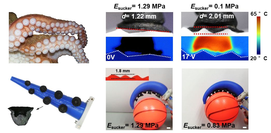 章鱼,同样是一种能够改变自身肌肉刚度的软体生物,为模拟章鱼的吸附能力,研究团队进一步将油水凝胶应用于仿生章鱼触手机器人吸盘。较硬的吸盘能够在较为光滑的表面上提供更大的吸附力,但在粗糙表面上,常因为自身的变形不足无法实现良好的密封,难以达到对粗糙表面的吸附;而较软的吸盘能够轻松实现在粗糙表面上的密封,但因为自身较易发生变形,通常难以提供大的吸附力。
