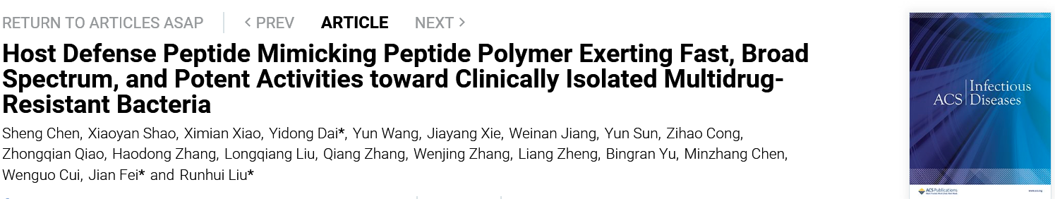 研究者从住院病人化验样本中分离、鉴定了45株临床细菌菌株。药敏分析发现大多数菌株对多种抗菌药物具有不同程度的耐药性;相当一部分菌株甚至对所有测试抗生素均具有耐药性,佐证了多药耐药性细菌感染的紧迫形势。刘润辉教授课题组前期研究中优选的抗菌多肽聚合物80:20 DM:Bu不仅在合成上具有很好的可重复性和可控性,且对上述临床分离的MDR细菌菌株仍表现出快速、广谱以及高效的体外抗菌活性,兼具较低的溶血毒性和细胞毒性。在铜绿假单胞菌感染的大鼠全皮层伤口感染模型中,该多肽聚合物具有与多粘菌素B相当的体内抗菌活性。这些特性都展示了该抗菌多肽聚合物在多药耐药临床细菌感染治疗方面的潜力。该研究成果以题为“Host Defense Peptide Mimicking Peptide Polymer Exerting Fast, Broad Spectrum, and Potent Activities toward Clinically Isolated Multidrug-Resistant Bacteria”发表在《ACS Infectious Diseases》杂志上。
