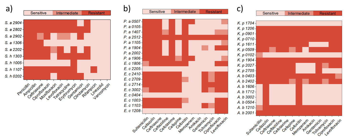 图2. 临床分离菌株的抗生素敏感性。(a)金黄色葡萄球菌和溶血葡萄球菌;(b)铜绿假单胞菌和大肠杆菌;(c)肺炎克雷伯氏菌和鲍曼不动杆菌。