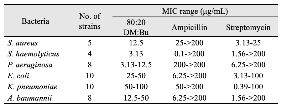 表1. 多肽聚合物80:20 DM:Bu及抗生素对临床分离菌株的MIC分布。