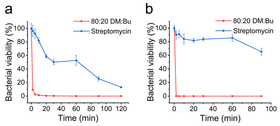 图3. (a,b)多肽聚合物80:20 DM:Bu以及链霉素的时间杀菌曲线。(a)溶血葡萄球菌1005;(b)鲍曼不动杆菌0504。