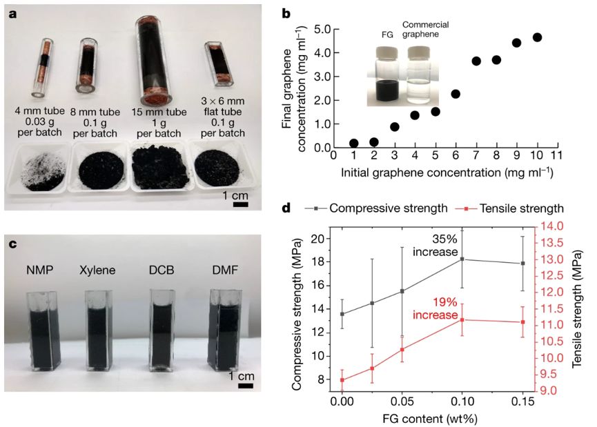 该工艺生产出的所谓“湍流型”石墨烯,其错层易于分离,与更常见的A-B堆叠石墨烯相比,它更易于分离和与材料结合。通过其他工艺(例如石墨剥落)制成的A-B堆叠石墨烯很难拉开。由于“湍流型”石墨烯层间的粘合力要低得多,所以层状石墨烯更容易加工。闪速石墨烯可能会成为未来的主要市场,该研究团队已在测试使用石墨烯增强的混凝土和塑料,希望在两年内扩大规模每天制造更多的闪速石墨烯。