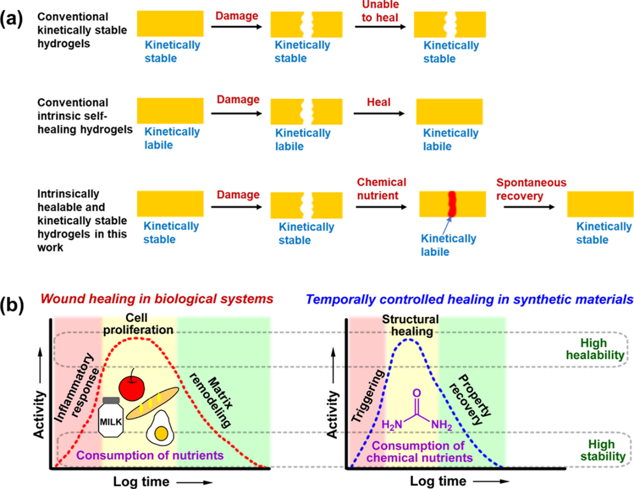 图1. 动力学稳定水凝胶的本征性修复概念图。(a) 不同材料在受损后的修复能力:传统的高动力学稳定性水凝胶不能修复;传统的本征型自修复水凝胶可以基于动态化学键或物理相互作用以实现修复,但它们通常不具备良好的动力学稳定性;该工作中制备的水凝胶兼具本征性可修复能力与高动力学稳定性,这是通过调节材料的临时修复性能来实现的。(b) 生命体与合成材料在时间上分级调控的修复过程。