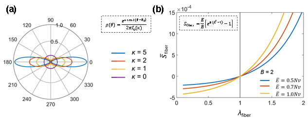 图2. 凝胶中微米级木纤维的力学模型 a)描述木纤维的取向性排布的概率密度函数。b)描述木纤维非线性力学行为的应力-拉伸比关系式。