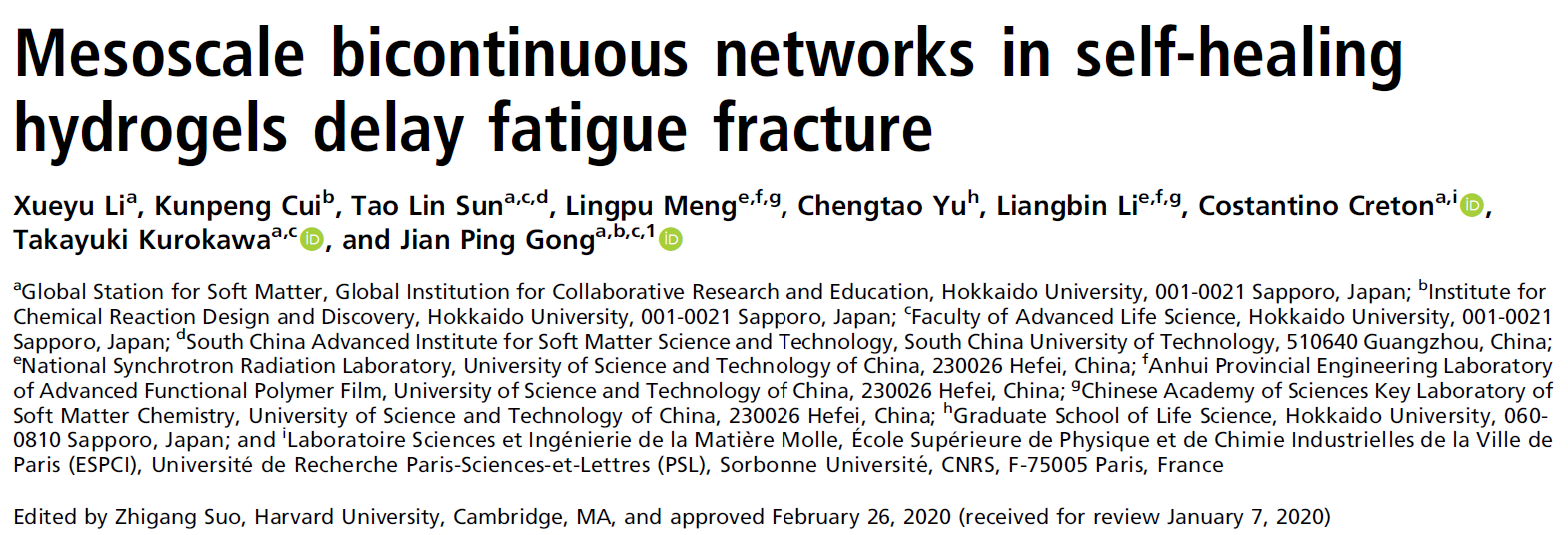 水凝胶作为一种与生物组织类似的材料,是研究生物组织机械行为的简化模型系统。聚电解质水凝胶(PA 胶)存在多尺度结构,并且具有高韧性、自修复等性能(Nat. Mater. 2013, 12 (10), 932–937,Phys. Rev. Lett. 2018, 121 (18), 185501)。以该水凝胶为模型体系,北海道大学龚剑萍教授与中科大李良彬教授,法国巴黎高等物理化工学院(ESPCI) Creton 教授合作,联合疲劳测试和原位小角X射线散射,揭示了该水凝胶中的多尺度结构的多步抗疲劳机理。研究成果以 “Mesoscale bicontinuous networks in self-healing hydrogels delay fatigue fracture” 为题发表在PNAS上。
