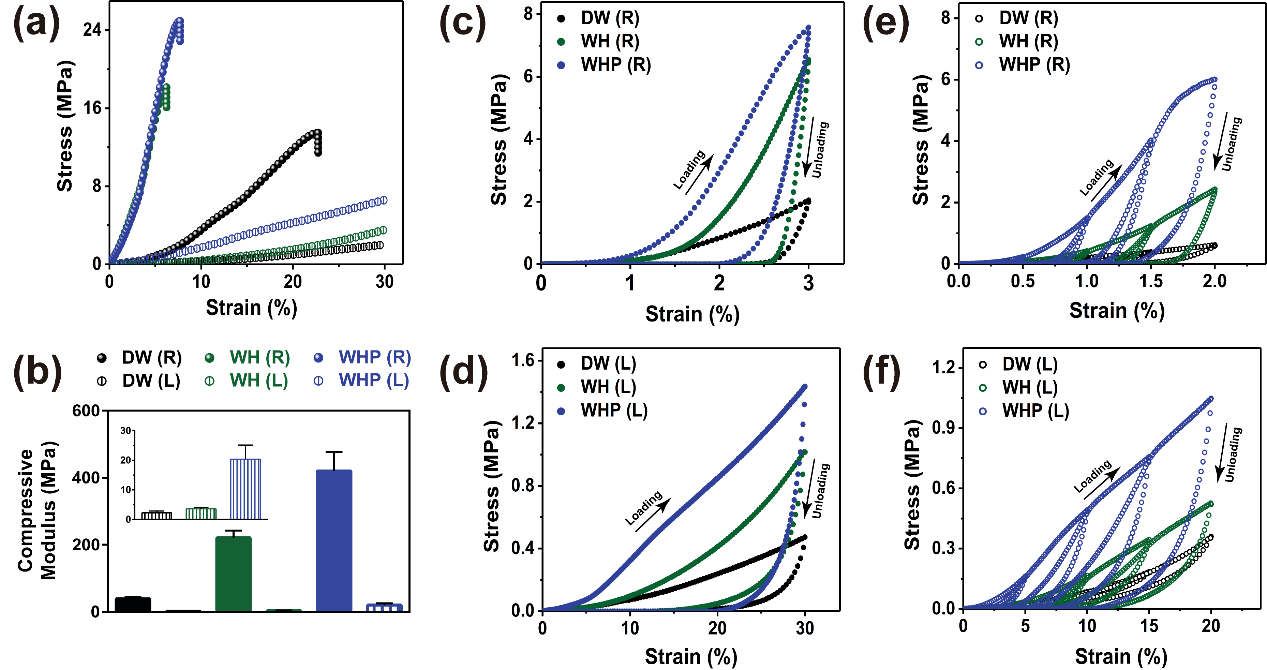 图3.不同支架不同方向的(a)压缩力学性能曲线;(b) 压缩模量;(c)(d) 循环压缩曲线;(e)(f)递进压缩曲线。