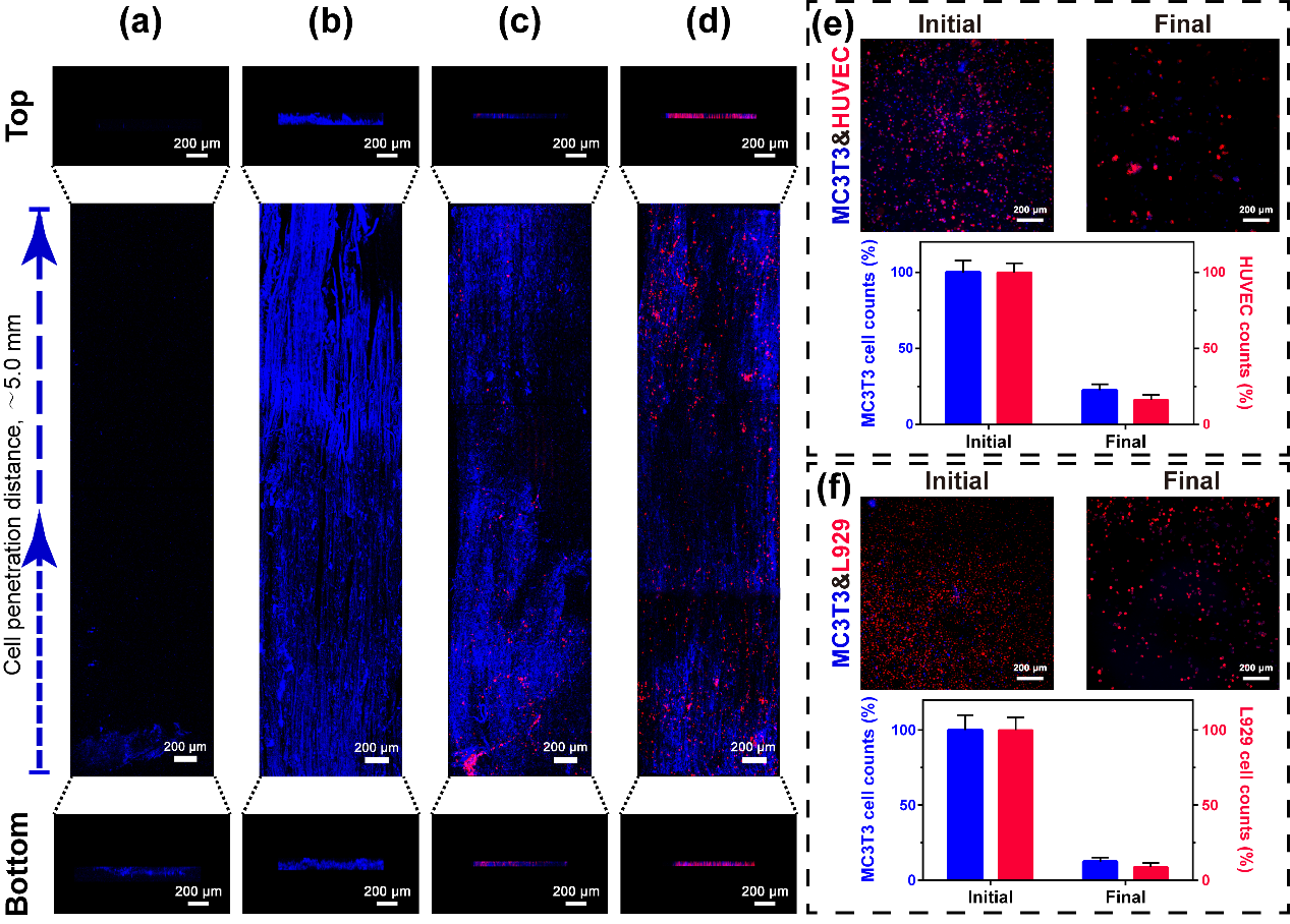 图3. (a)control支架和(b)WHP支架内MC3T3-E1(蓝色)细胞迁移情况;WHP支架中MC3T3-E1(蓝色)细胞与(c)HUVEC(红色)或(d)L929(红色)细胞共迁移情况。细胞培养皿中(e)MC3T3-E1细胞与HUVEC和(f)MC3T3-E1细胞与L929细胞共迁移前后的细胞量