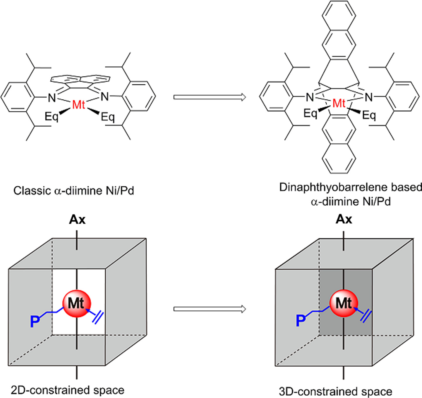 α-二亚胺镍钯催化剂作为一种典型的后过渡金属催化剂体系,具有高活性以及对极性基团容忍性好的优点。其催化烯烃聚合的理论模型是一个被广泛接受的 “配位水平面—轴向”二维模型(图1)。水平面是聚合物增长链和烯烃配位点;苯胺上大的取代基能够屏蔽轴向的空间,抑制链转移反应,从而能够制备得到高分子量的产物。基于这样一个被广泛接受的二维聚合理论模型,近年来研究工作主要集中于增大苯胺邻位的空间位阻,从而提高催化剂的耐热性和聚合物分子量。而从空间的三维尺度而言,经典α-二亚胺镍钯催化剂俯视图中的上下面以及侧视图中的左右面均被取代基屏蔽;然而正视图中金属中心的前、后面仍是开放的(图1)。正面可供烯烃单体进行配位插入以及聚合物增值链,但开放的背面使得极性基团或抗衡阴离子易从此方向与金属中心发生作用,从而影响催化剂的活性、热稳定性以及乙烯和极性单体共聚的效果。
