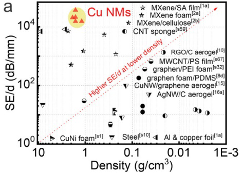 图3.金属包裹多孔膜的EMI性能比较。(a)不同密度下材料SE/d的性能,(b)不同厚度下材料SSE性能。