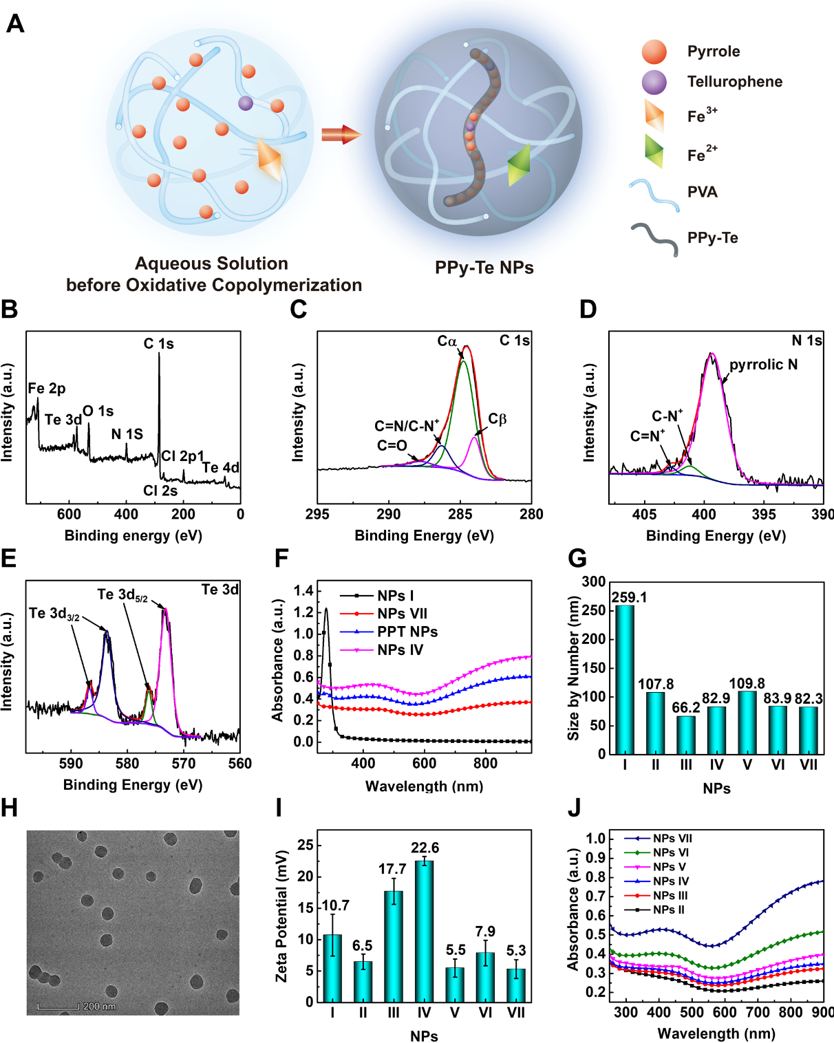图1(A)PPy-Te NPs的制备示意图。(B-E)蚀刻后的NPs IV的全谱和C 1s,N 1s,Te 3d电子的XPS光谱。(F)NPs I,NPs VII,NPs IV和PPT NPs的UV-Vis-NIR吸收光谱(NPs的浓度为100μg mL-1)。(G)通过DLS测量的NP I-VII的大小。(H)NPs的TEM图像 比例尺,200 nm。(I)通过DLS测量的NPs I-VII的ζ电势。(J)NP II-VII(100μg mL-1)的UV-Vis-NIR吸收光谱。
