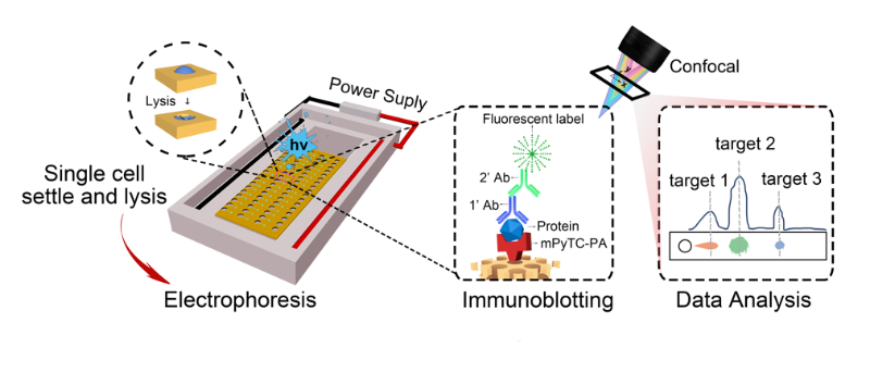 单细胞免疫印迹技术(scWestern),采用可扩展开放式的微孔阵列凝胶芯片,通过重力作用驱动细胞沉降落孔,经化学裂解细胞并整合SDS-PAGE电泳分离细胞裂解释放的蛋白质,后以短时间紫外线激发(~60s)激活光敏性凝胶,凝胶与蛋白质交联而固定蛋白质固定于凝胶内。紫外交联替代了传统western blot中繁琐的转膜流程,实现在4h内完成单细胞内多种蛋白的表达水平分析。scWestern结合了SDS-PAGE的分子筛效应,通过蛋白质的分子量和抗原抗体识别双重验证,保证了检测的特异性,可检测细胞表面蛋白、跨膜蛋白、胞内及核内的蛋白,可区分经表观遗传修饰蛋白。单细胞免疫印迹技术可实现高通量、多指标共检,并在单细胞水平研究复杂细胞群体,在药物筛选、细胞异质性研究等方面具有重要的应用价值。