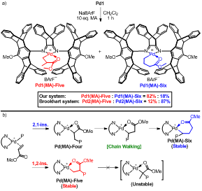 从传统思维考虑,线性主链官能化聚乙烯(无链行走)与支化支链末端官能化聚乙烯(链行走)最容易合成,机理也最容易理解(图1)。超高支化聚乙烯结构意味着快速的链行走,而极性基团插入到主链结构意味着无链行走发生;因此,超高支化主链官能化聚乙烯结构是看似矛盾的。为探究这一独特结构形成的原因,我们进行了详细的实验机理研究。