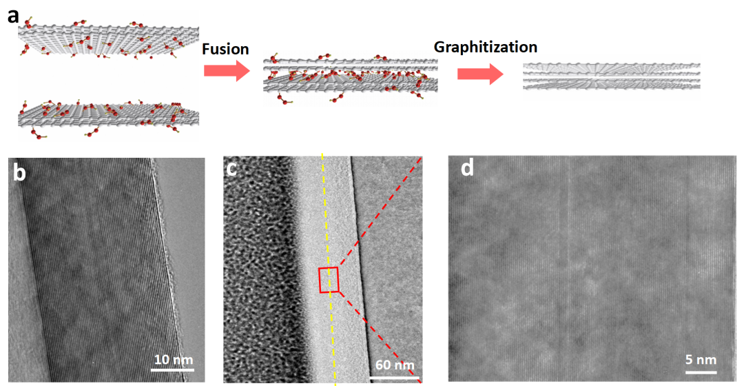 图4:(a)纳米膜之间融合的机理。(b)TEM下30 nm石墨烯膜的截面。(c,d)TEM下粘接法制备的60 nm石墨烯膜截面。