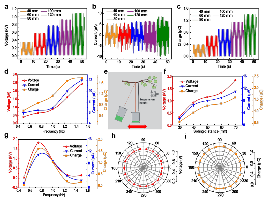 图3. MC-TENG器件的输出性能测试:(a-c)MC-TENG在不同振动幅度下的开路电压,短路电流和转移电荷;(d)MC-TENG在不同振动频率下的输出性能;(e)MC-TENG摆动模式示意图;(f)1 Hz频率下,MC-TENG在不同滑动距离下的输出性能;(g)在30 mm悬挂高度下,MC-TENG在不同摆动频率下的输出性能;(h, i)MC-TENG在不同摆动方向下的输出电压和电荷。