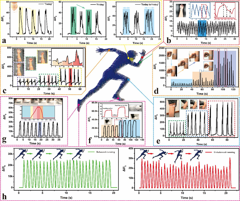 图4. 声音震动(a)、脉搏(b)、肌肉扩张(c)、敲击(d)、屈膝(e)、站立(f)、行走(g)以及跑动状态(h)的监测。