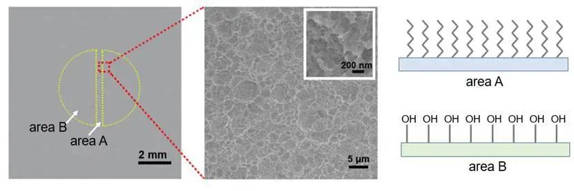 研究人员在低粘附的固体表面设计制备了高粘附的图案。由于该制备通过选择性分子修饰过程实现,因此整个表面的物理形貌相同,仅存在化学分子层的差异。