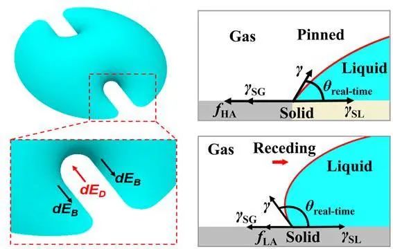 研究人员对该过程进行了建模和分析,发现控制液滴在固体表面行为的因素为固液之间的粘附力。通过对表面粘附力的调控,能够诱导铺展液膜产生各向异性的回缩行为。基于对该过程的分析,研究人员提出了液滴切割过程的定量化控制规律。