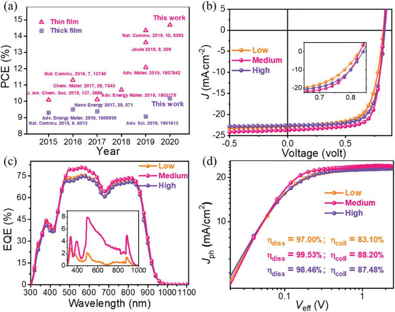 图4. a)近五年全小分子有机太阳能电池的器件效率总结。以不同浓度溶液制备的全小分子有机太阳能电池的b)J–V曲线,c)EQE谱图d)Jph-Veff曲线。