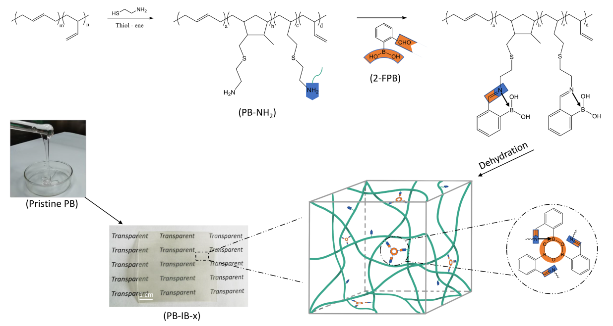 针对上述问题,白晨曦研究员团队通过对聚合物结构设计,提出了一种简便有效的方法,将可交换的亚胺键和氮配位的硼氧六环引入到聚丁二烯(PB)网络结构中,在室温下通过无催化剂的一锅法,制备具有可再加工和形状记忆行为的可延展性高强度聚丁二烯基透明材料(PB-IB-x)。如图1所示,巯基乙胺接枝的PB与苯硼酸的甲酰基反应脱水,形成双动态共价交联网络。通过调整交联密度,不添加任何填料或添加剂,拉伸强度可达到12.35 MPa。