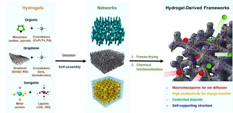 另外,水凝胶具有相互连接的三维纳米结构、大的表面积和大量质量/电荷传输通道,可以用作分层功能框架材料(如碳、氧化物、金属和合金基框架材料)的理想前驱体(图2)。3D分层多孔纳米结构水凝胶还用作模板以制造各种基于金属氧化物或碳的骨架的纳米颗粒和粉末。