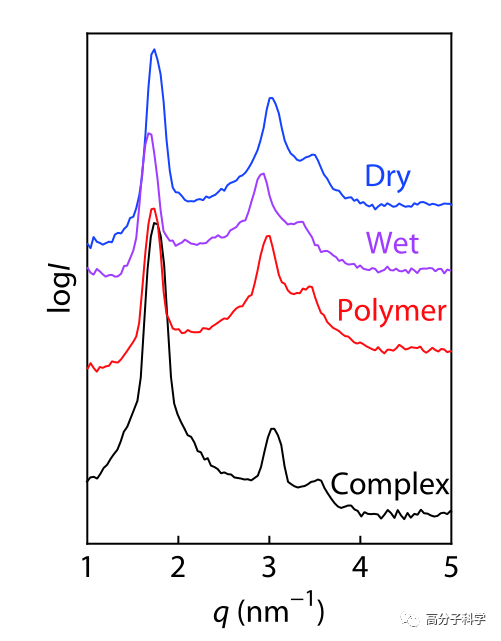 图3. 氢键复合物、交联后的聚合物、溶剂刻蚀后的纳米多孔聚合物(湿润或干燥)的MAXS图