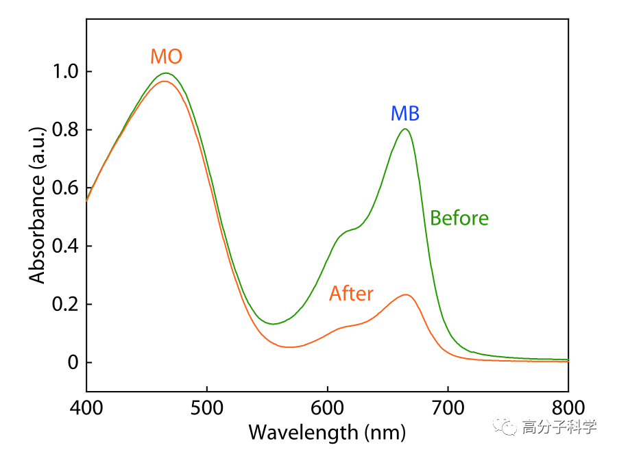 图4. 纳米多孔聚合物对MB与MO混合溶液吸附前后的UV-Vis图